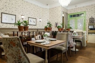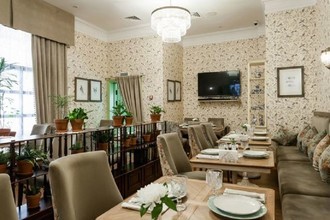 Дизайн заведения напоминает уютный загородный дом или проще сказать дачу. На стенах поклеены светлые обои с птичками, а на окнах висят плотные шторы и узорчатая тюль. Пространство залов заполнили комфортные мягкие диваны и кресла, деревянные столики с вазами для цветов и красивой посудой, напоминающую о былом времени.